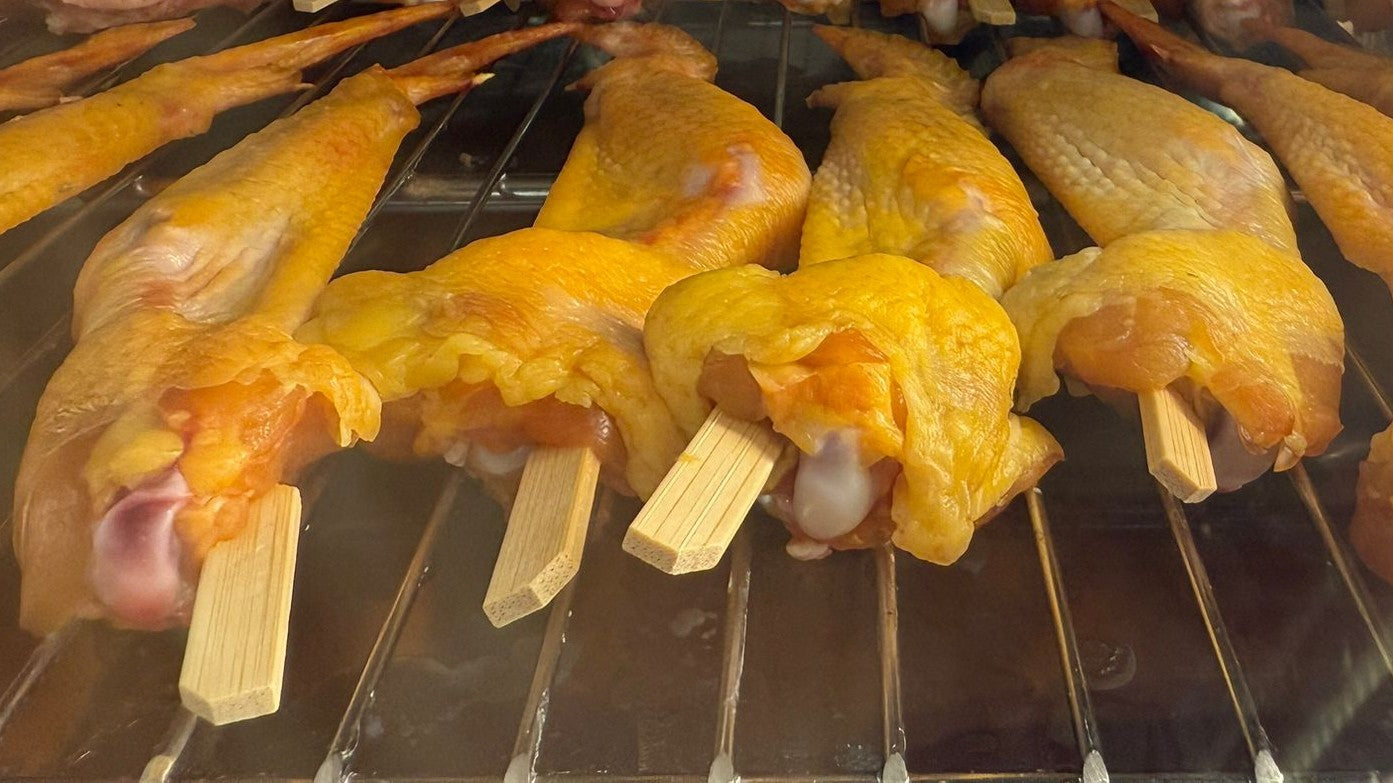 精選優質南方雞種─ 三黃雞。肉質嫩滑,皮脆骨軟,脂肪豐滿且味道鮮美。用獨家秘製白滷水醃製一整晚,風乾後的皮更脆、肉味更濃,且肉嫩多汁。