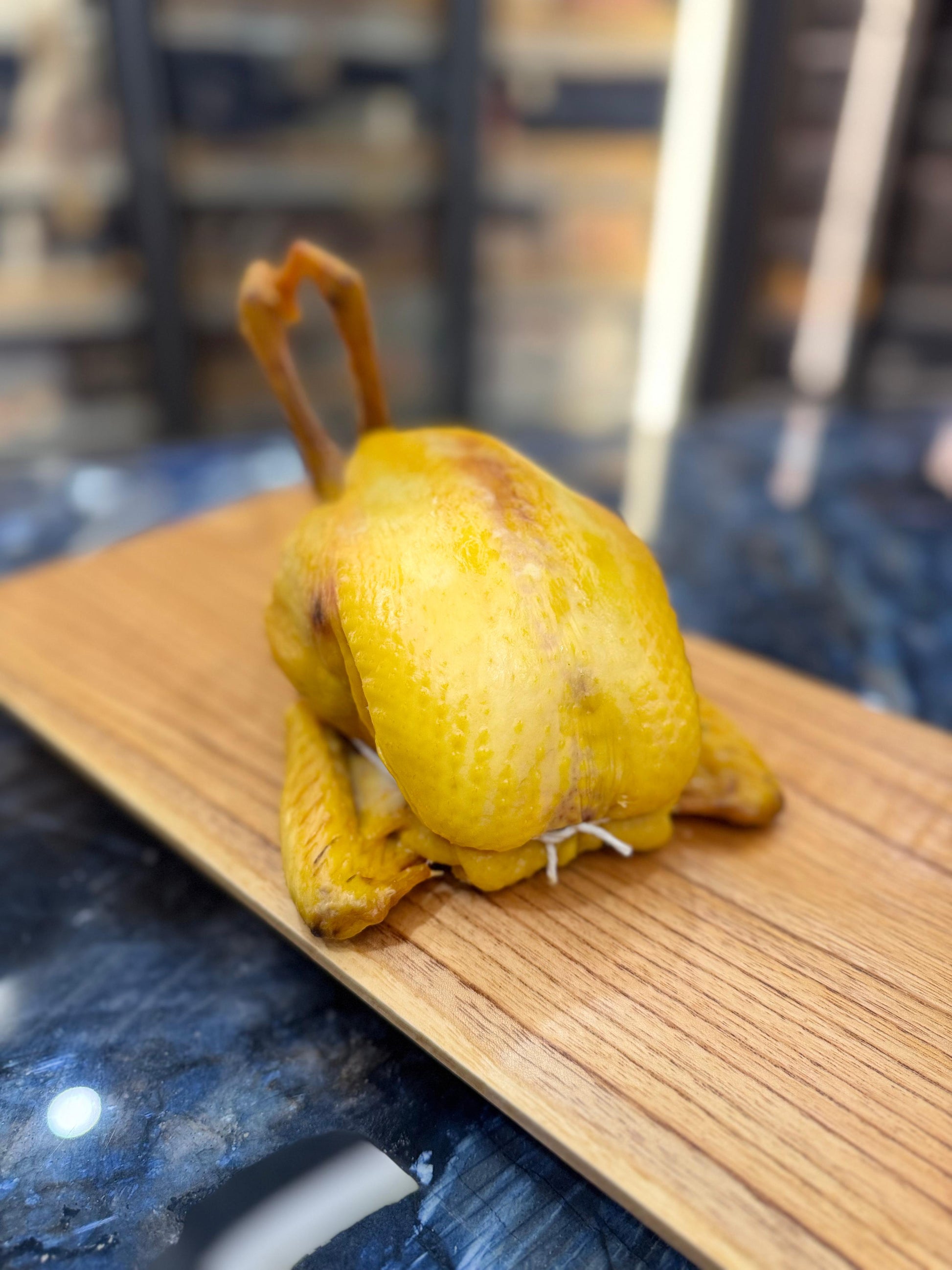 精選優質南方雞種─ 三黃雞。肉質嫩滑,皮脆骨軟,脂肪豐滿且味道鮮美。風乾後的皮更脆、肉味更濃,且肉嫩多汁。配菜可選西蘭花、椰菜花、蕃茄或甜椒。